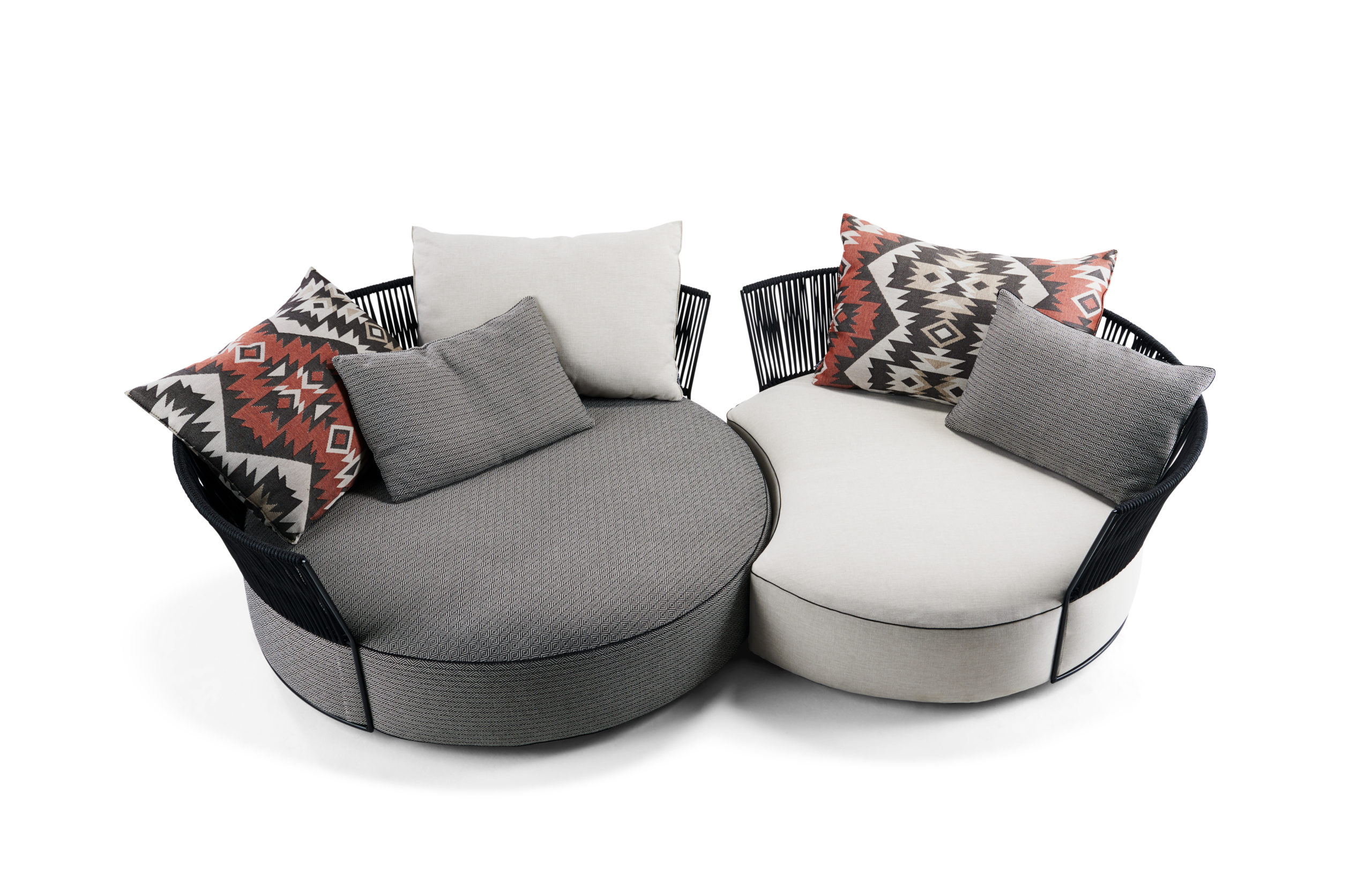 Island in the sun. Extravagante Wohnelemente für den Aussenbereich – mit einem Hauch von Exotik. Ein Rückzugsort zum Träumen und Entspannen, geprägt durch opulente, runde Polstersitze und einen filigranen Stahlrücken, umrahmt von einem Geflecht aus starken Seilen. Auf Wunsch mit Schirm lieferbar. 360° Drehfunktion optional. Outdoor Textilien und Nahtverarbeitung wählbar. Dazu passend: Wind- und Regenfeste Abdeckhülle.