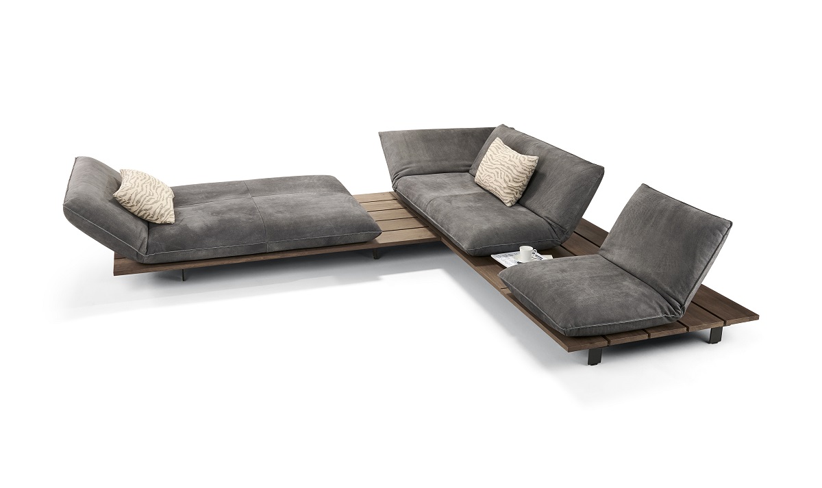 Aus zwei Sofas lässt sich eine gemütliche Eckgruppe bilden. Durch die manuelle oder motorische seitliche Verstellung erhält man eine praktische Abstellmöglichkeit neben der Sitzfläche. Legerer Look und lässige Polsterung für individuelles Wohnen auf höchstem Niveau.