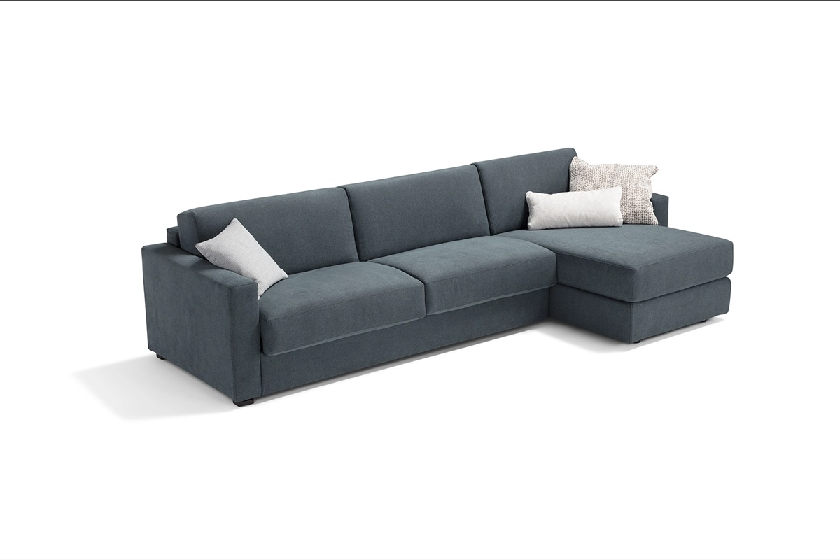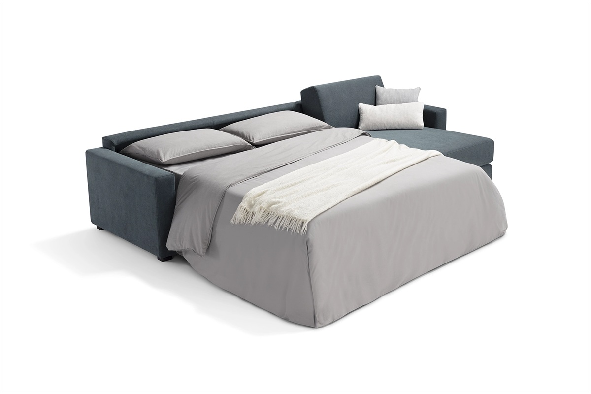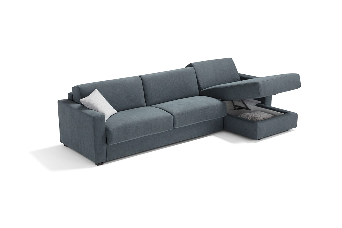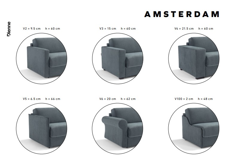 Das modulare Schlafsofa Amsterdam wird allen Bedürfnissen gerecht: Es ist mit oder ohne Chaiselongue mit Stauraum erhältlich und verfügt über sechs verschiedene Armlehnen sowie eine 13 cm dicke Matratze.
