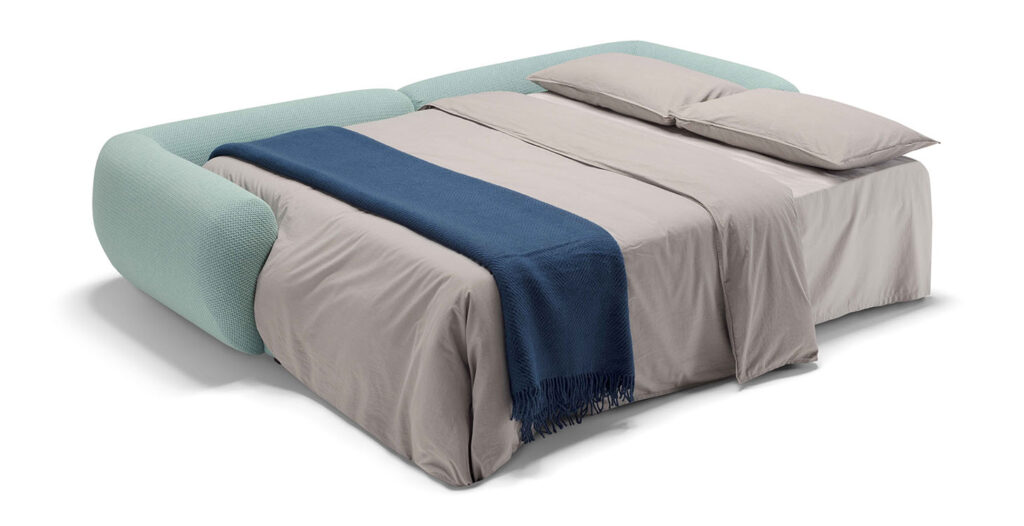 Die Standardmatratze mit einer Höhe von 13 cm bietet optimalen Schlafkomfort. Die Sitzfläche kombiniert einen oberen Bereich aus weichem Memory-Material mit einer stützenden Schicht aus Polyurethan, während das Rückenteil mit Polyurethan hoher Dichte gepolstert ist. Optional kann das Sofa mit einem Mechanismus mit Rollen ausgestattet werden, der die Handhabung noch flexibler macht.