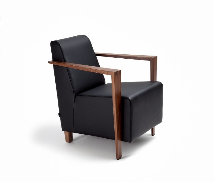 Die reduzierte Formensprache eröffnet dem Modell vielfältigste Einsatzmöglichkeiten und gibt den Blick frei auf interessante Details, wie die Armlehnen aus Massivholz, die in Buche oder Nussbaum ausgeführt werden können, wahlweise mit einer stumpfen oder einer gezinkten Holzverbindung.