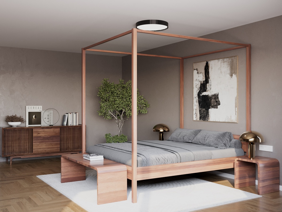 Das Bettgestell besteht aus massivem Holz und wird in Handarbeit gefertigt. Die natürliche Maserung des Holzes verleiht dem Bett eine warme und gemütliche Ausstrahlung. Die filigranen Füße aus Edelstahl sorgen für einen schwebenden Effekt und unterstreichen das moderne Design.