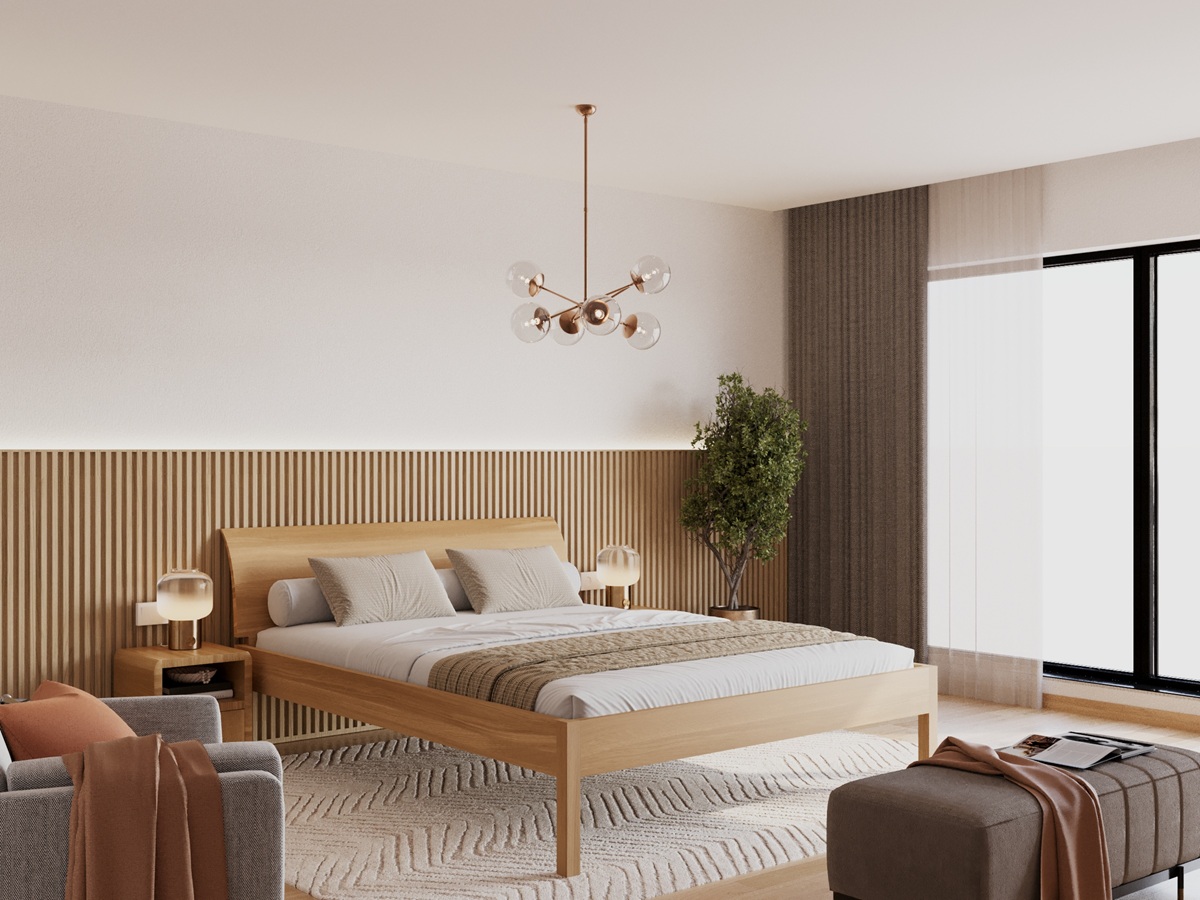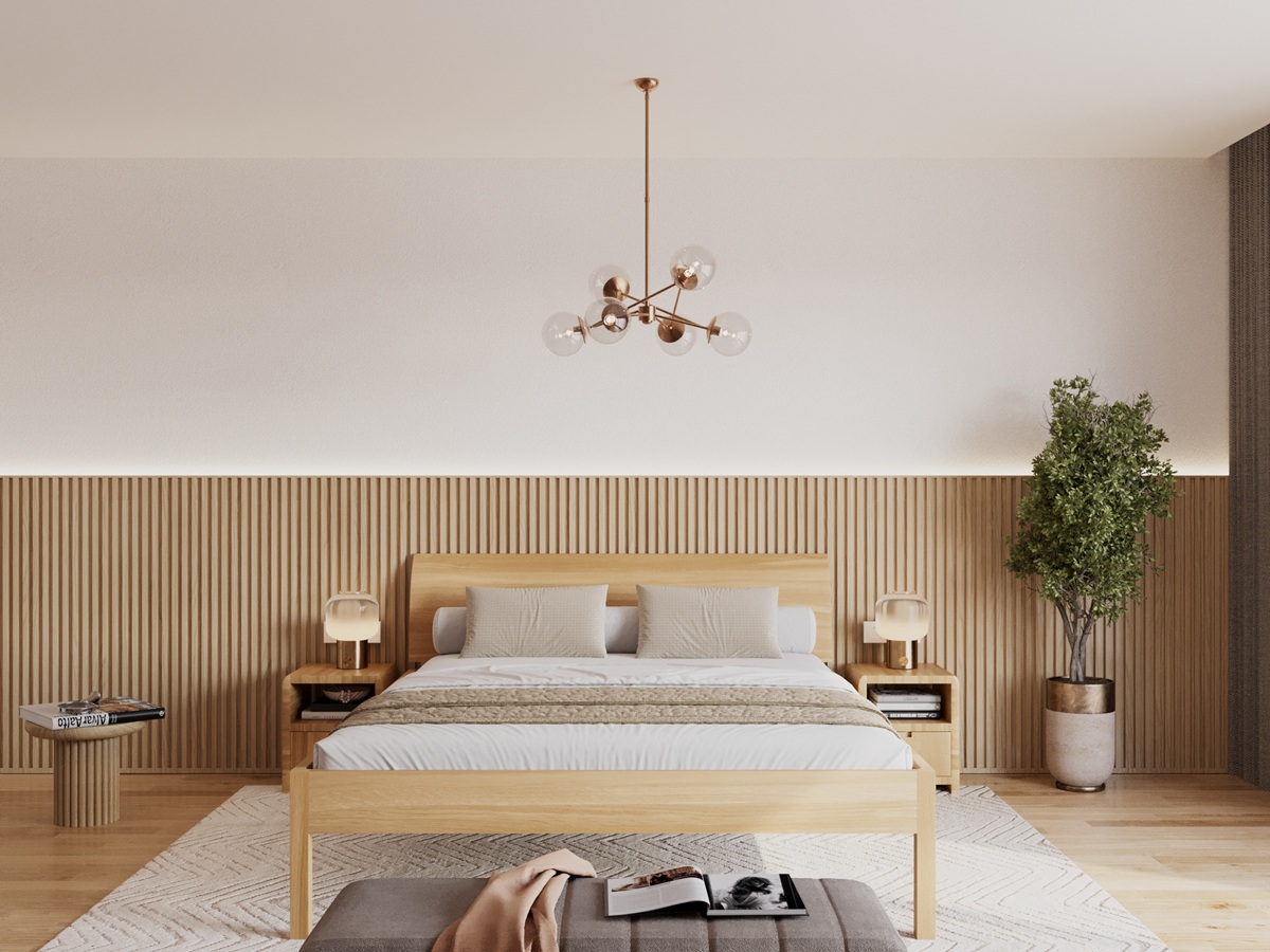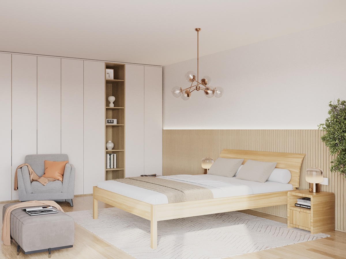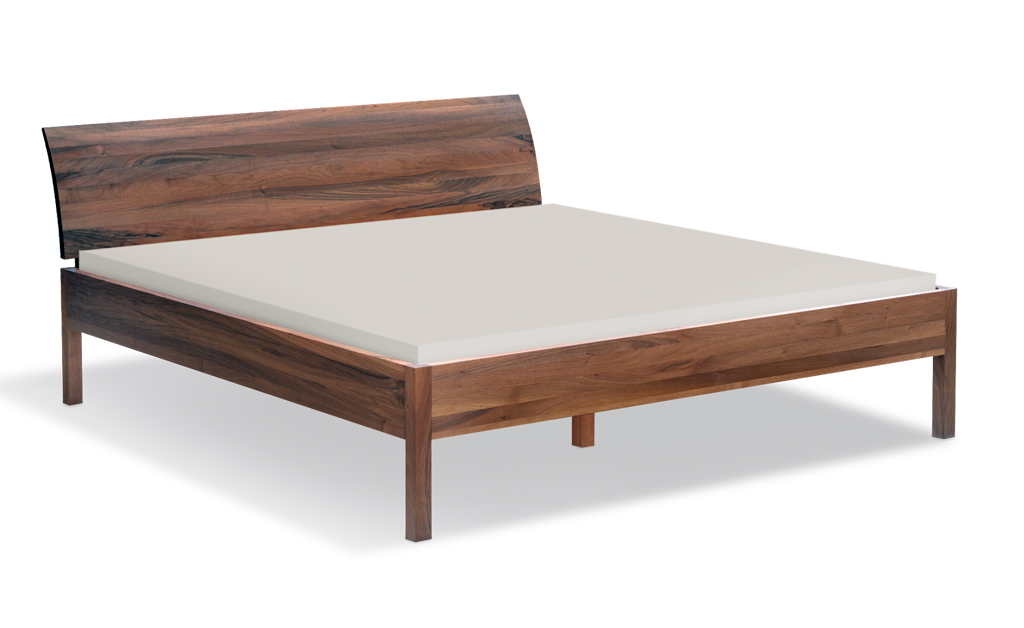 Die leicht nach hinten geschwungene Rückenlehne und der kantige Schliff am Kopfteil passen sich der geometrischen Form des Bettes an, während die Ebenheit der Holzoberflächen den Massivholzcharakter zusätzlich betont.