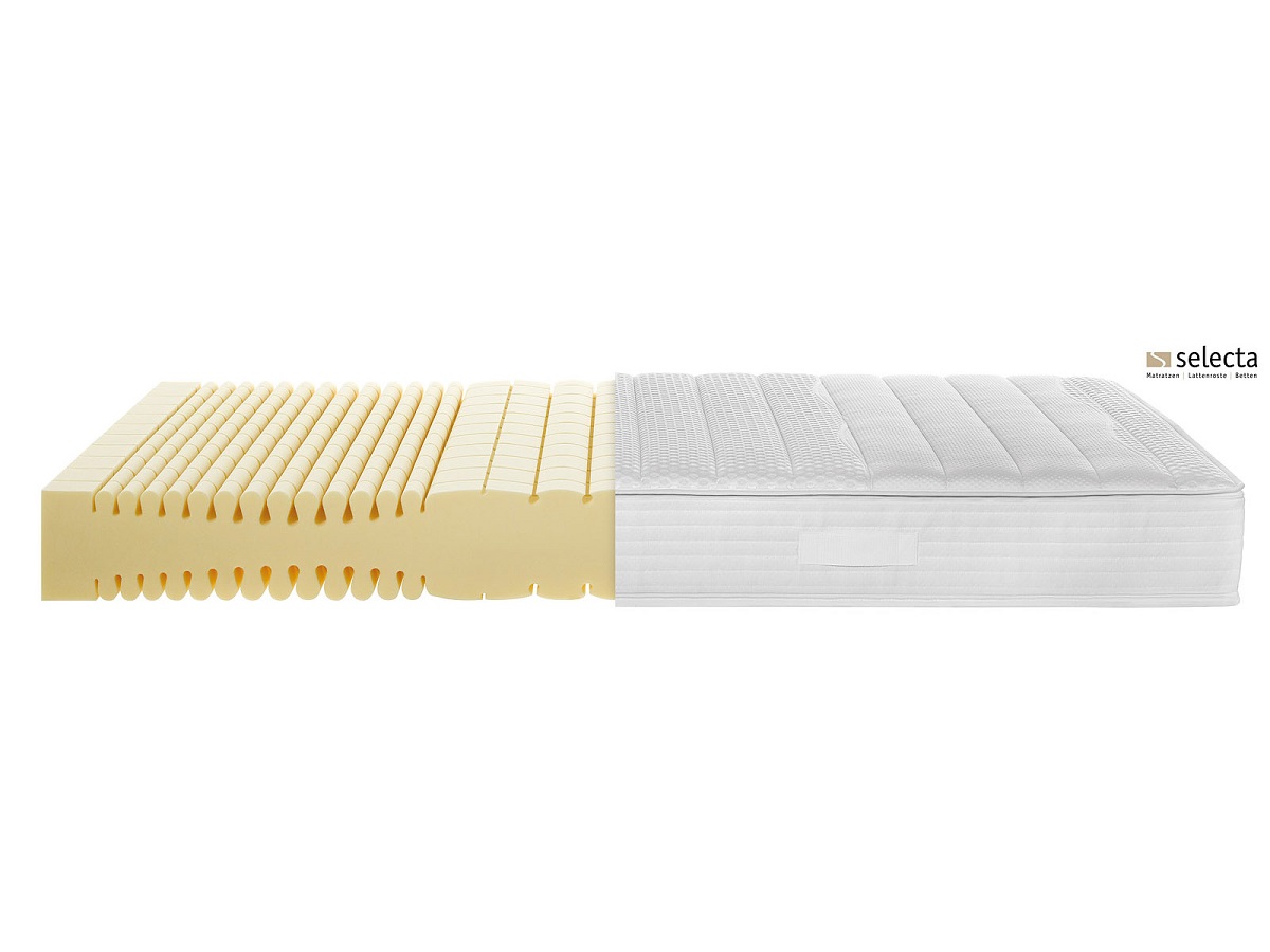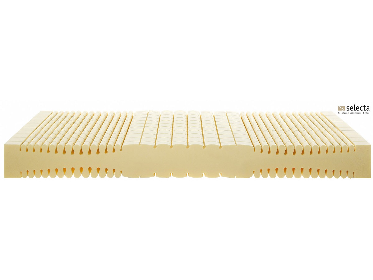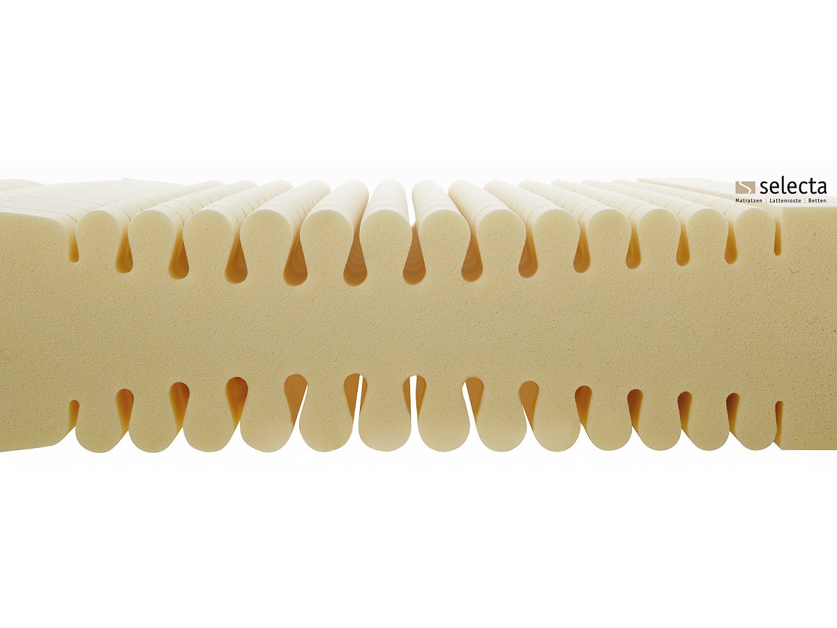 Die Selecta Kaltschaummatratze S19 mit hochverdichtetem HR-Kaltschaumkern ist durch den ausgeklügelten Oberflächenschnitt mit Längs- und Querprofilierung äußerst anpassungsfähig. Integrierte Körperkomfortzonen sorgen für ein ausgewogenes Verhältnis von Stützung und Nachgeben.