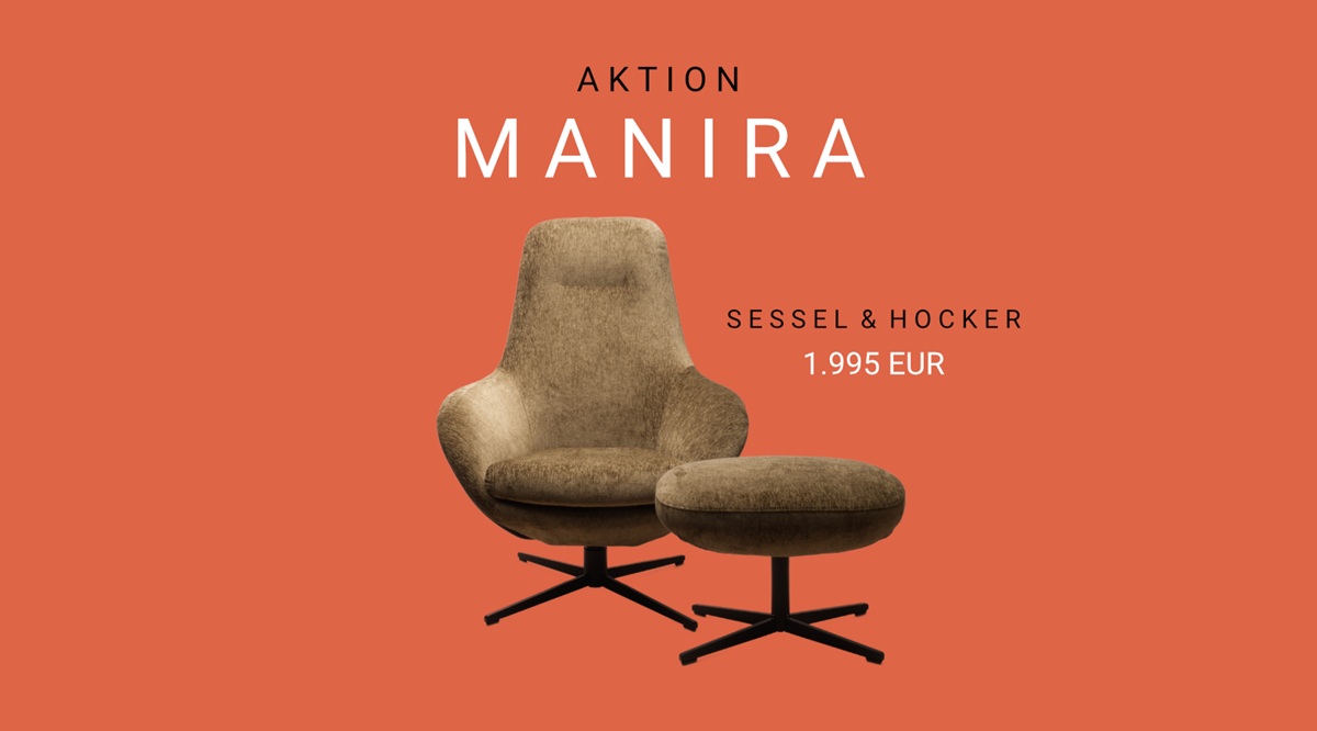 Relax-Sessel MANIRA mit Dreh- und Kippfunktion sowie Hocker, bezogen im Stoff „Verona“ in sechs möglichen Farben, mit schwarzem Gestell zum Aktionspreis von 1.995,- € anstatt 2.283,- €.