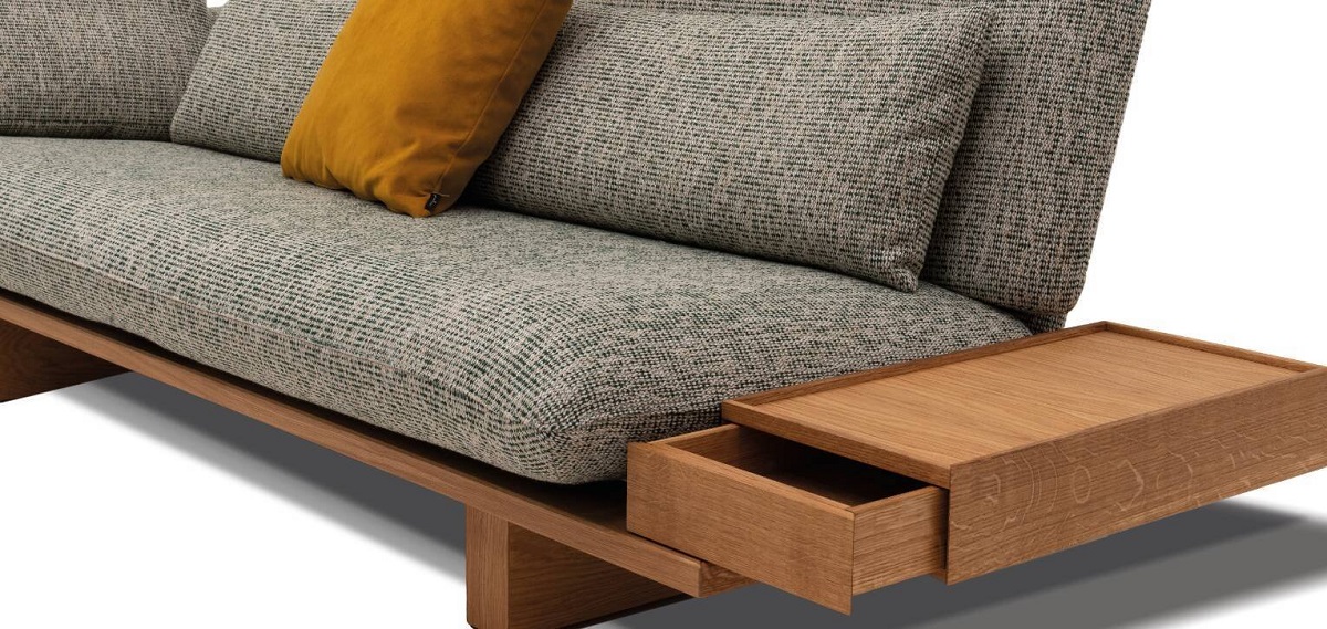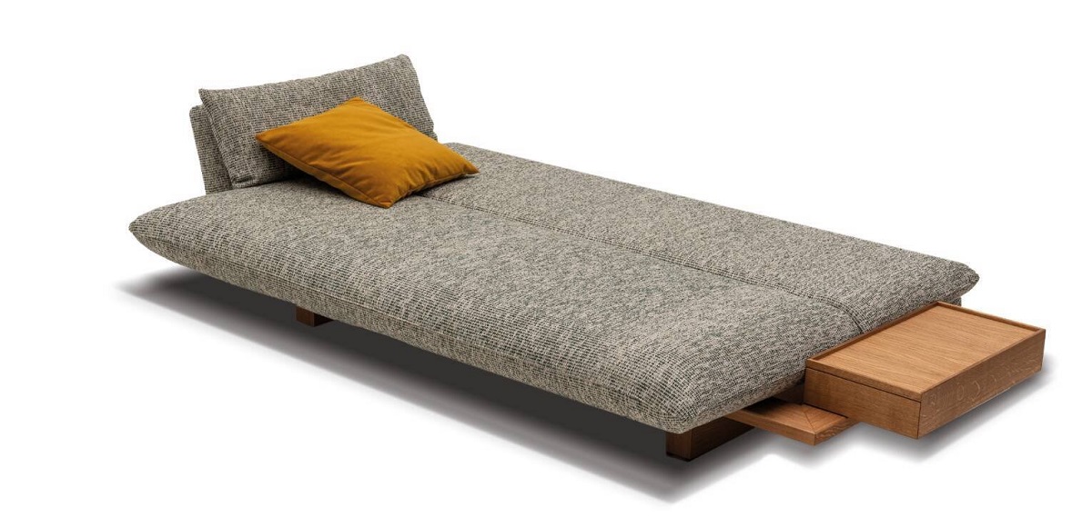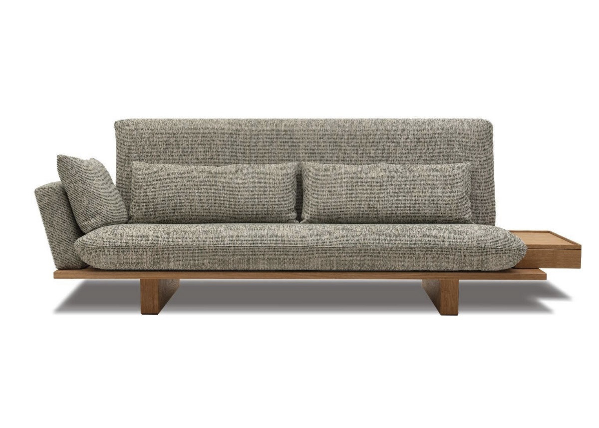Veda kann wahlweise mit gepolsterten Rückenlehnen oder dem raffinierten Staukasten ausgestattet werden. Die durchdachte und mit entsprechenden Bohrungen vorbereitete Grundkonstruktion ermöglicht es, die Ausstattung auch im Nachhinein jederzeit zu verändern. Das handwerklich gefertigte Untergestell ist in Nussbaum, Eiche oder Buche erhältlich und unterstreicht die Natürlichkeit und Wertigkeit des Möbels. Veda ist wahlweise mit Holzwangen oder integriertem Bettkasten erhältlich. Die Bezüge sind immer abziehbar. Passende Zierkissen sind als Zubehör erhältlich.