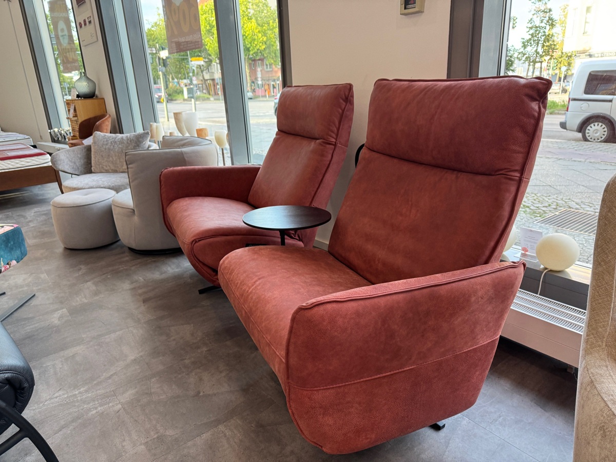 Sie erhalten hier 2 Lounger Linca mit jeweils einem Armteil, im Leder Bronco amarena, Akku, Anbautisch, Sternfuß.