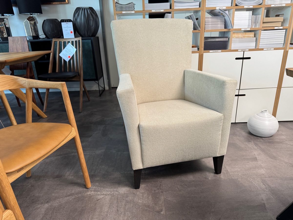 Sie erhalten hier den Hochlehnsessel Liz ohne Kappnaht, Bezug Brooklyn beige, Füße wenge gebeizt.